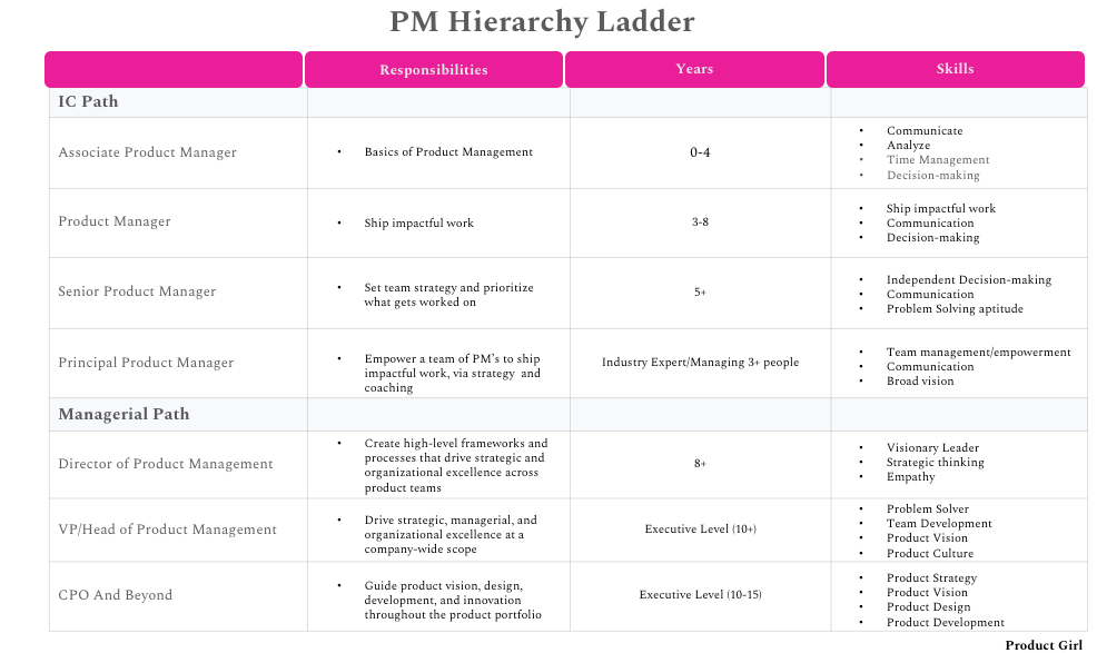 šØ Important Note: The IC paths, levels, and years of experience may vary by company in addition to expectations, but the progression of responsibilities remains consistent. The early part of your career will focus on launching new features and/or products. As you progress to the mid-level you will will pivot towards strategy. Once you start moving towards the senior level organizational excellence will be your main area of focus.